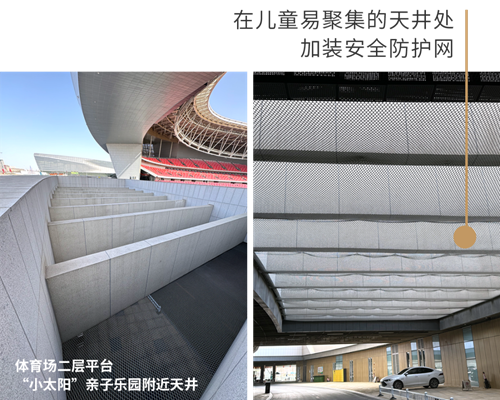快樂成長,安全為先。為了確保兒童游樂區(qū)的安全,鄭州奧體中心從細節(jié)處著手精心加裝了多種防護裝置,在奧體中心西北角區(qū)域加裝隔離花箱、石墩,確保行人與機動車分離。同時,在體育場二層平臺兒童聚集較多的天井內(nèi),加裝防護網(wǎng);在健身器材一側(cè)加裝防護欄;在通往二層平臺的步梯兩側(cè)加裝防滑球......這些防護裝置均經(jīng)過嚴格的現(xiàn)場論證和質(zhì)量檢測,確保其具有優(yōu)異的耐用性和穩(wěn)定性。通過這些措施,鄭州奧體中心致力于為孩子們打造一個既充滿樂趣,又安全無虞的游樂環(huán)境。