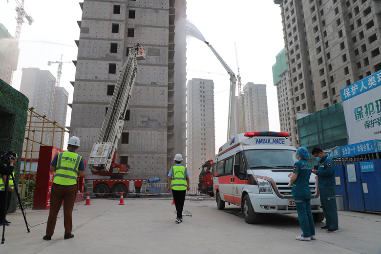 啟動儀式上,在工地現場開展了消防救援應急演練。該環節模擬施工現場發生火災時,現場管理人員應急操作反應及配合市消防救援支隊展開滅火救援的案例。演練現場火災模擬真實生動,4部消防車、1部救援車、1部救護車實地奔赴現場開展滅火及救援。整個演練過程現場組織嚴密、人員到位快速、操作程序得當,達到了預期效果。宣誓環節,由中建二局三公司代表引領各參賽單位代表共同開展安全宣誓。趙新中為各參賽單位授旗。