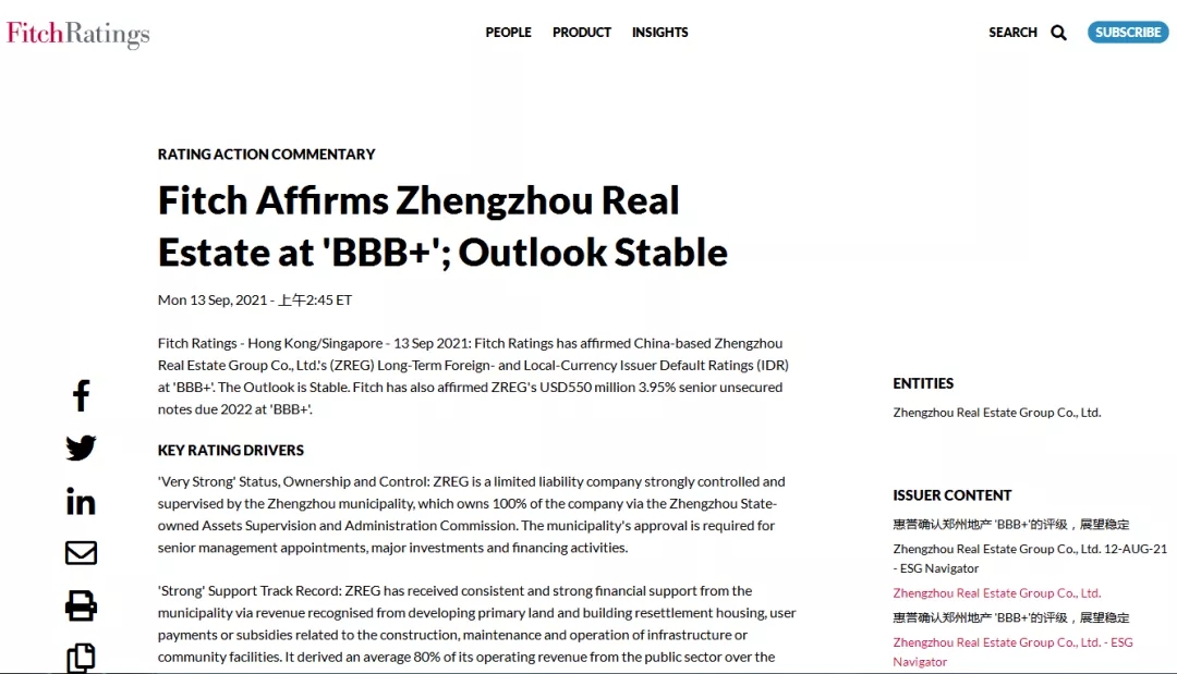 2021年9月13日,惠譽國際評級確認鄭州地產集團有限公司(簡稱:鄭州地產)發行人評級為“BBB+”,展望穩定。